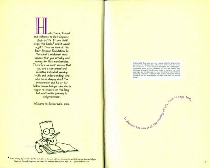 I look for the meaning of life using the book Bart Simpsons Guide To Life.